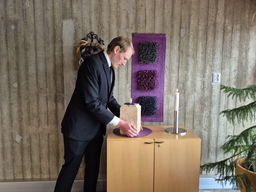 Siunauskappelin vahtimestari Aatu Kapiainen asettelee uurnaa uurnanluovutushuoneessa. Kuva: Timo Nurila.