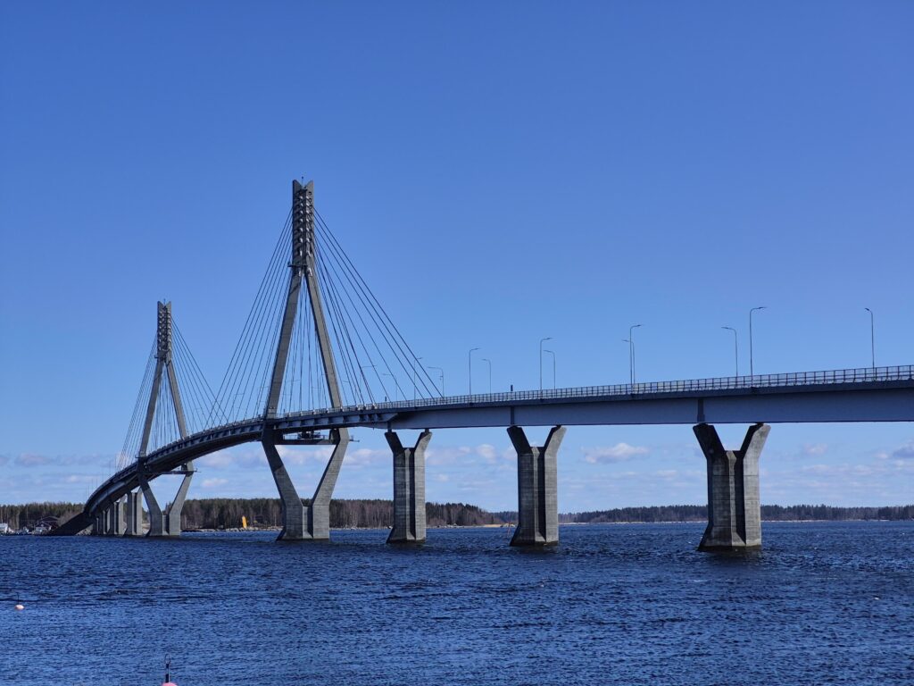 Raippaluodon silta on yli kilometrin mittainen. Maantieyhteys Uumajaan olisi 94 kilometriä, josta 30 km mantereella, 18 km pengerteillä ja 46 km silloilla.  Kuva: Timo Nurila.